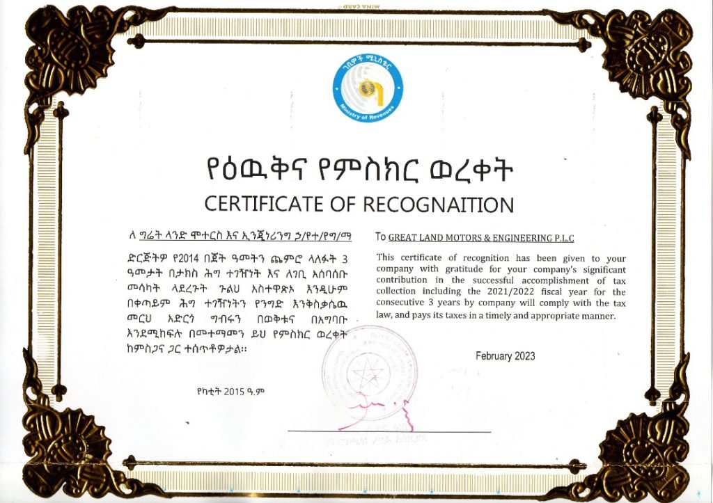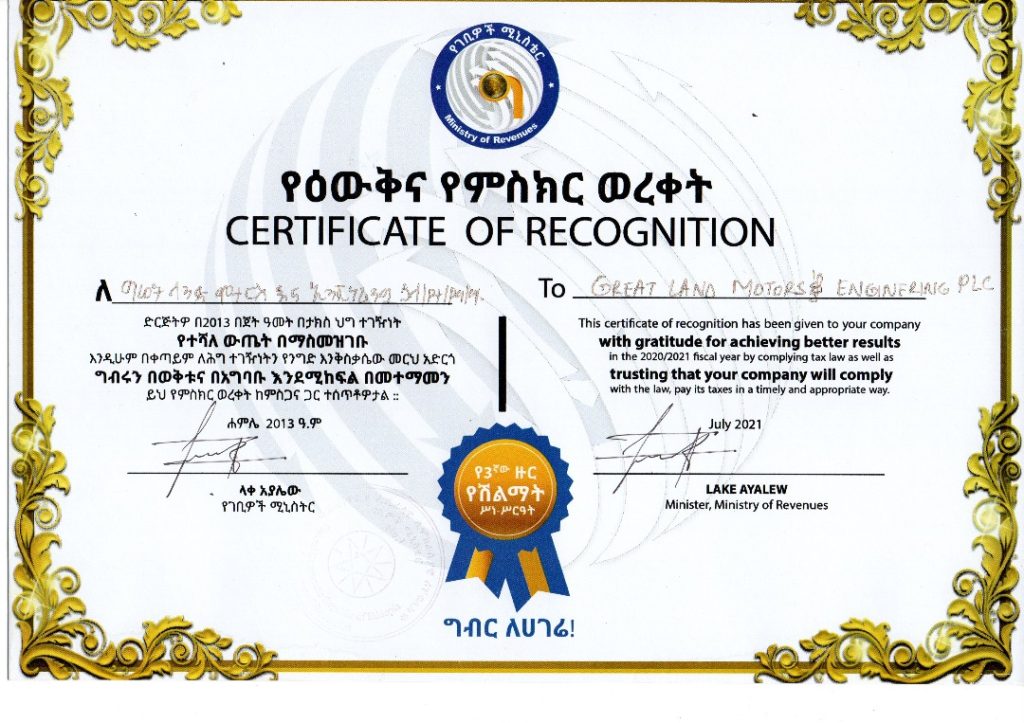 Certificate of Recognition by Oromia Constructions Contractors Association