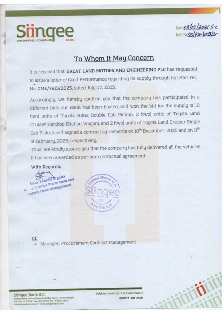 Testimonial letter by Siinqee Bank